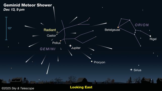 Метеорний потік Гемініди активний приблизно з 4 по 17 грудня. Цього року Місяць буде у фазі спадаючого серпа, приблизно на 26% повного сяйва під час піка Гемінідів, а це означає, що його сяйво не повинно перешкоджати видимості яскравих метеорів.