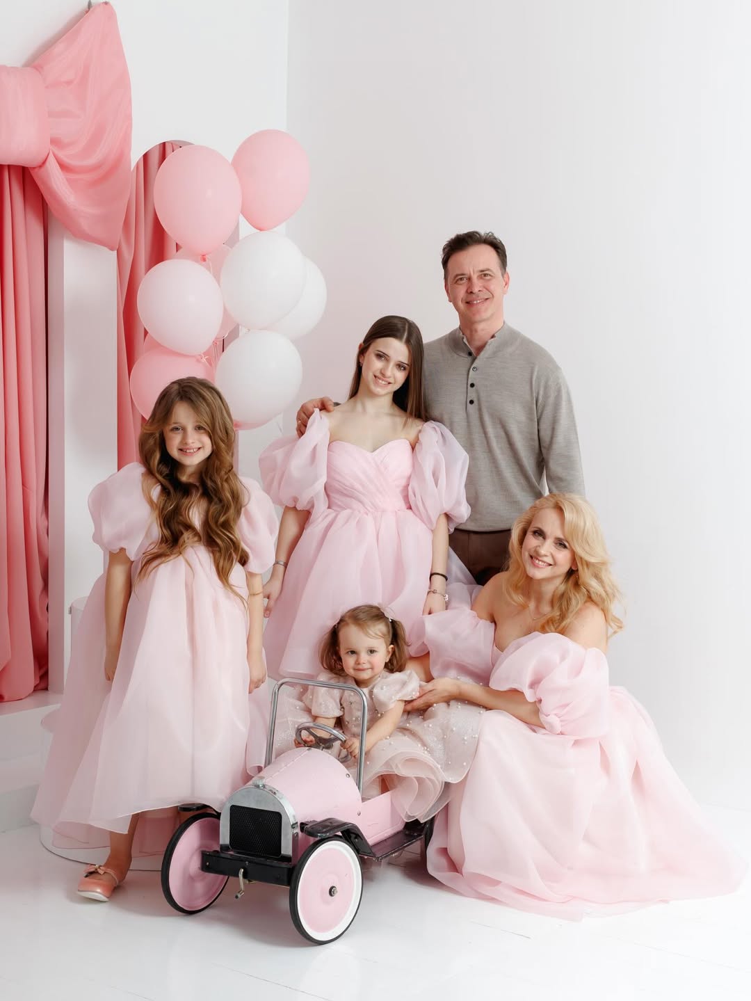 Самі образи родини виглядали яскраво та стильно: Лілія обрала білу мініспідницю, рожеву сорочку та високі білі чоботи, а маленька іменинниця виблискувала як справжня принцеса у пишній сукні з метеликами.
