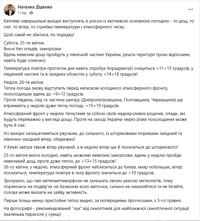 Прогноз погоди від Наталки Діденко (скриншот: facebook.com/tala.didenko)