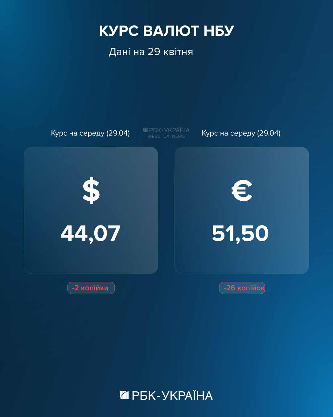 - На 29 квітня офіційний курс долара знизився до 44,07 грн, євро – до 51,50 грн.
